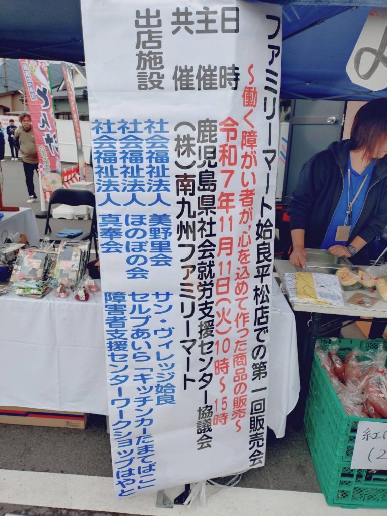 ブログ (本日11/11限定☆)ファミリーマート姶良平松店にて販売しています♪ 2025年11月11日 X(旧twitter) facebook LINE 障がい者就労施設の商品をもっと知って! あなたと、コンビニ! 南九州ファミリーマート様のご協力のもと 駐車場を開放していただきました! 対面販売にてサンヴィレッジ姶良の 利用者や商品が、皆様をお迎えしています♪ ぜひ、この機会に地元の障がい者施設の心こもった商品を 知っていただきたいと思っています❣ 地元のコンビニ!地域のコミュニティ! サンヴィレッジ姶良は地域の皆様とともに がんばっています! よろしくお願いいたします☆彡